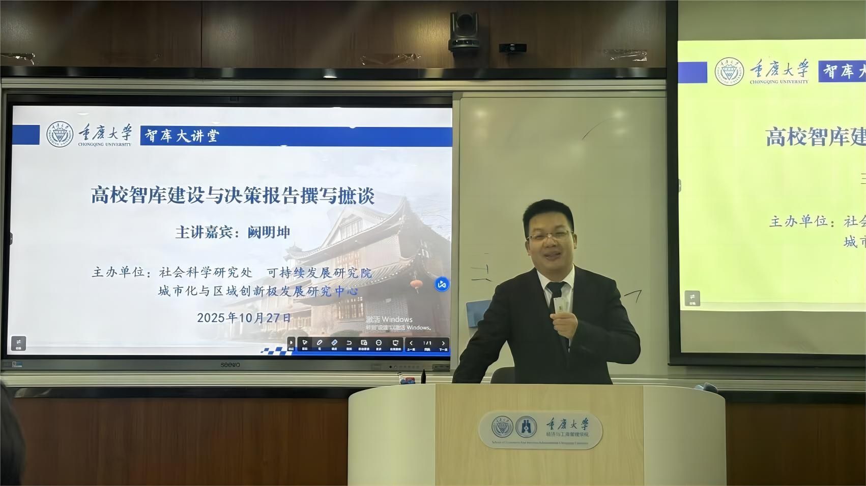 10月27日上午,社会科学研究处和城市化与区域创新极发展研究中心、可持续发展研究院联合举办的重庆大学智库大讲堂在经济与工商管理学院409会议室顺利举行。本次智库大讲堂由社科处副处长吴永求教授主持,特邀了浙江大学国家高端智库教育学院分中心执行主任、浙江大学国家制度研究院特聘研究员阙明坤主讲。全校有50余位师生参加。本次大讲堂主题为“高校智库建设与决策咨询报告撰写摭谈”。阙明坤研究员对高校智库建设与决策咨询...