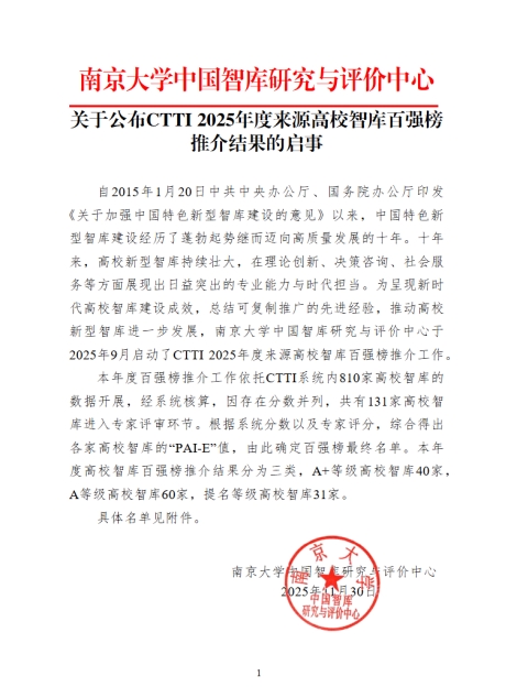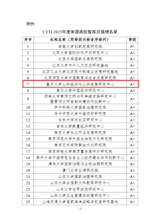 2025年11月30日,南京大学中国智库研究与评价中心公布CTTI2025年度来源高校智库百强榜名单。重庆大学公共经济与公共政策研究中心入选,并获评为重庆地区唯一A+等级的高校智库。