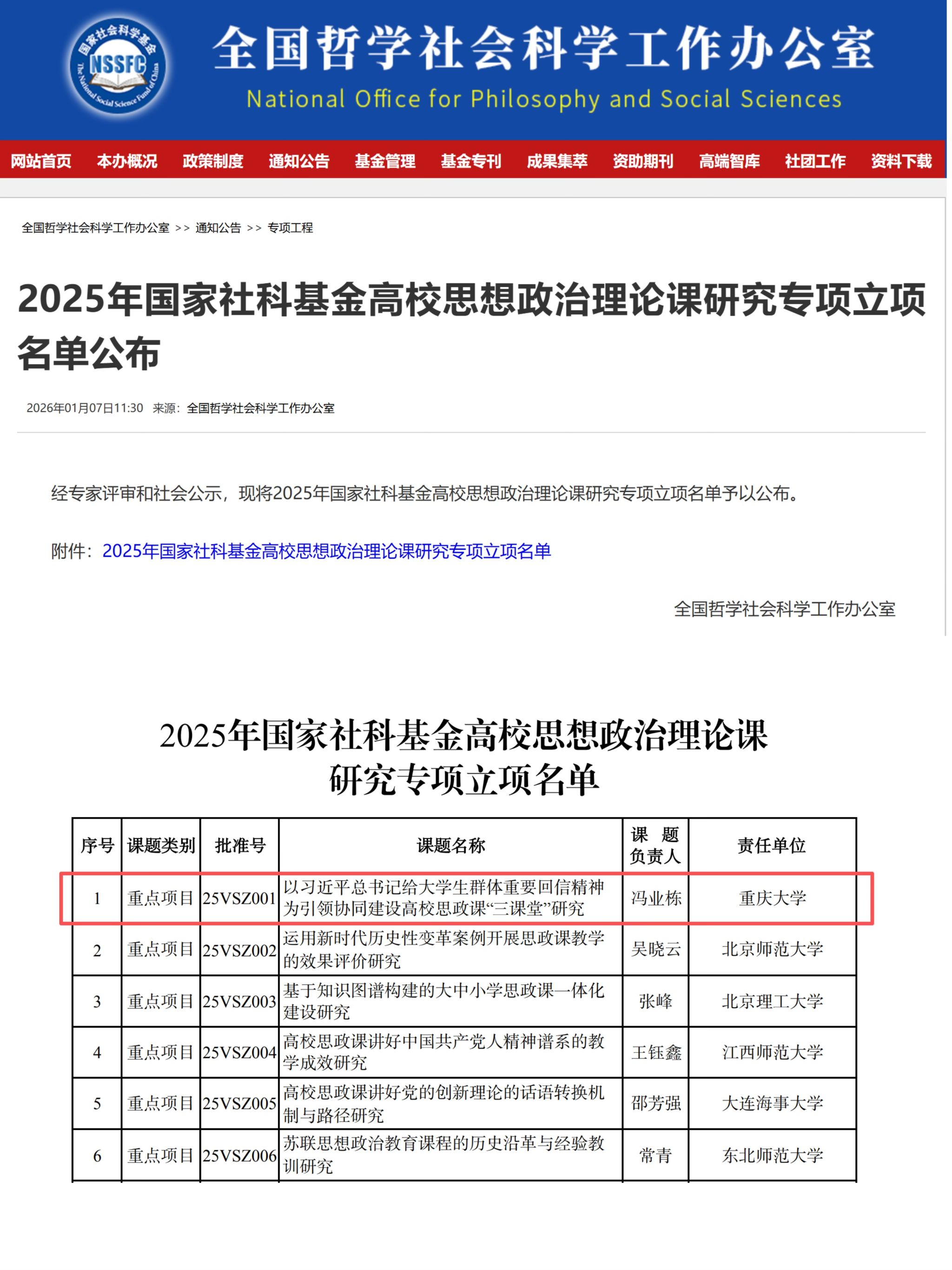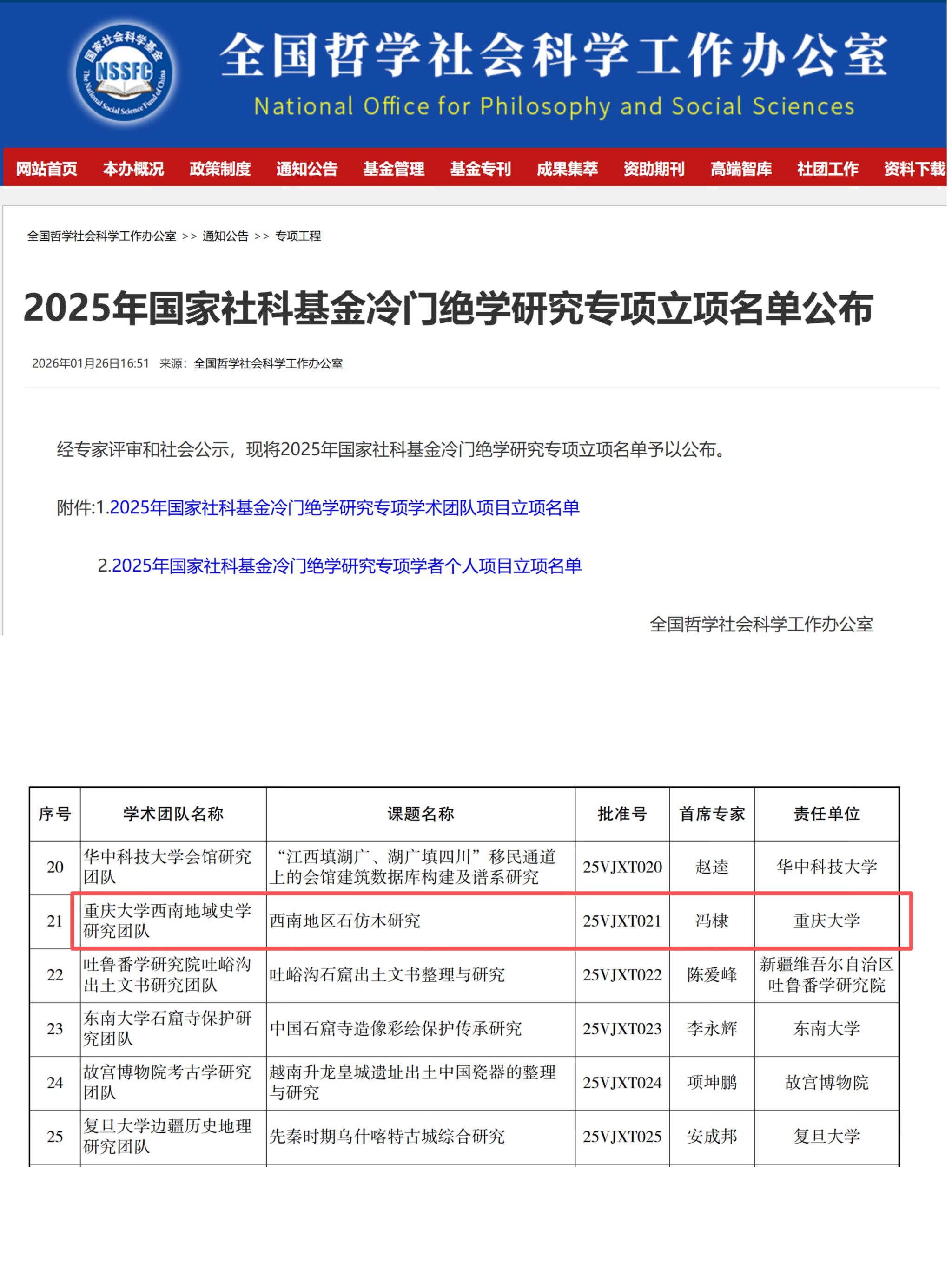 2026年1月26日,2025年国家社科基金冷门绝学研究专项立项名单正式公布,我校建筑城规学院冯棣教授领衔的重庆大学西南地域史学研究团队申报的《西南地区石仿木研究》获批学术团队项目(重庆市唯一),这也是我校首次在该专项中获批学术团队项目。学术团队项目参照国家社科基金重大项目标准给予资助,每项资助60-80万元,本次共立项36项。国家社科基金冷门绝学研究专项重点支持对国家发展、文明传承、文化安全具有重要意义或填补...