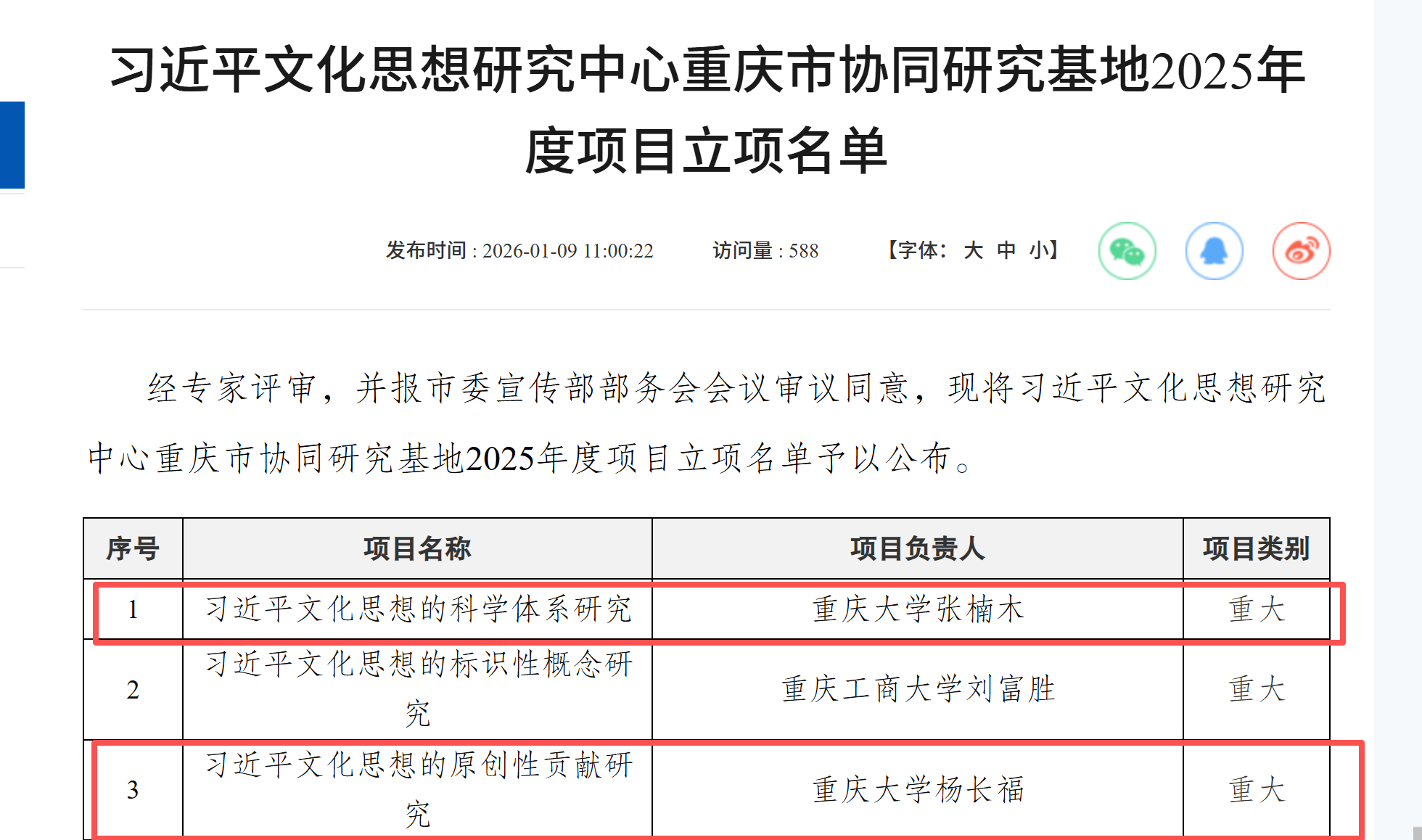 2026年1月9日,习近平文化思想研究中心重庆市协同研究基地2025年度项目立项名单公布,本次全市共获批重大项目17项,我校张楠木、杨长福两位教授获得重大项目立项